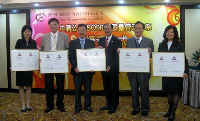 11月26日,澳门中旅(国际)酒店管理有限公司ISO9001:2008质量管理体系授证仪式在帝濠酒店21楼会议室隆重举行。来自香港品质保证局林宝兴总裁、澳门生产力暨科技转移中心关敏如理事长等嘉宾、南光集团李志忠副总经理及吕小平助理总经理、集团行政人事部及发展规划部的有关领导、酒店公司领导、本部及在澳各酒店部门主管以上人员、内审员共82人列席。 酒店公司及在澳4间酒店分别接受了香港品质保证局颁发的ISO9001:2008质量管理体系认证证书。