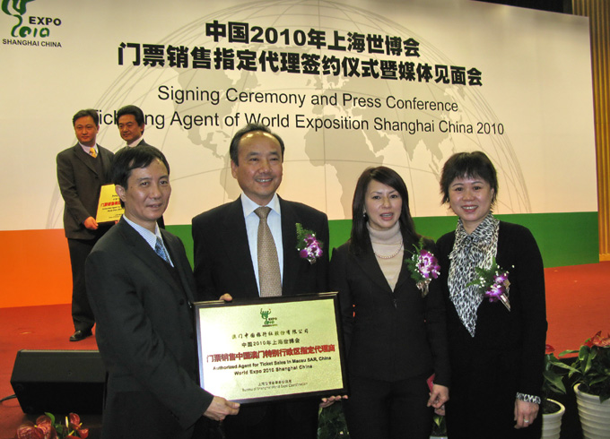 3月2日,在南光集团许开程董事长的见证下,中旅公司柯海帆总经理作为中国2010年上海世博会门票首批指定代理商代表在签约仪式上签字。参加本次签约仪式的企业共有13家,其中内地4家包括了中国电信、中国移动、中国邮政和交通银行;境外9家有日本JTB公司、香港中旅、澳门中旅、台湾中旅等。