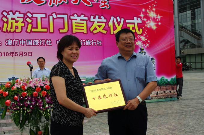 中旅公司荣获由江门市旅游局颁发的2009年组团江门游“十佳旅行社”牌匾。作为中国第一侨乡的江门市,五邑乡亲遍布全世界,仅澳门就有约二十万人祖籍江门,同为拥有世界文化遗产的城市。中旅公司一直注重与江门市的旅游合作,自2009年年初以来,针对江门丰富的旅游资源,推出了多款不同的旅游产品,如澳门至开平世遗旅游专线车,开平碉楼游,恩平温泉游,台山海岛游,赤坎古镇游等等。极大地促进了澳江两地旅游业的交流与合作,带动了澳江两地旅游业的发展。