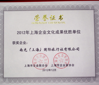 12月7日,上海市企业联合会、上海市企业家协会联合举办的“弘扬企业文化、建设和谐企业、2012年企业文化成果发布会暨《和谐力量》新书首发式”在上海花园坊孔堂举行。上海市精神文明建设委员会办公室、上海市总工会、上海市人力资源和社会保障局、上海市工商联等领导出席会议并向获得“2012年上海企业文化建设优胜单位”颁奬”;南光(上海)国际旅行社有限公司秋雯副总经理作为获奖单位代表应邀参加会议,领取了荣誉证书。