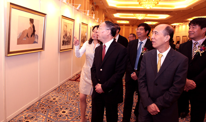 澳门会议展览业协会会长、南光(集团)有限公司副总经理李志忠,澳门颐园书画会名誉会长崔世昌,会长崔世平,北京弘宝博艺文化发展有限公司董事总经理常红,中国美术家协会理事、北京美术协会副主席孙志军,澳门中华文化艺术促进会会长彭桦,中国艺术研究院、中国画院常务副院长满维起,澳门美术协会会长黎鹰,主持人、画家董浩等,共同出席开幕仪式并剪彩。澳门会议展览业协会会长、南光(集团)有限公司副总经理李志忠致辞表示,主办方-澳门中华文化艺术促进会展出的36位当代新工笔画和水墨艺术家的72幅作品,将中国画的话题置于全球化的语境之下进行探讨,在普及大众艺术教育的同时也引发了人们对水墨和工笔画创作的对话与思考,并通过这个平台,把中国画艺术家的整体创作状态完美的呈现给了澳门观众。