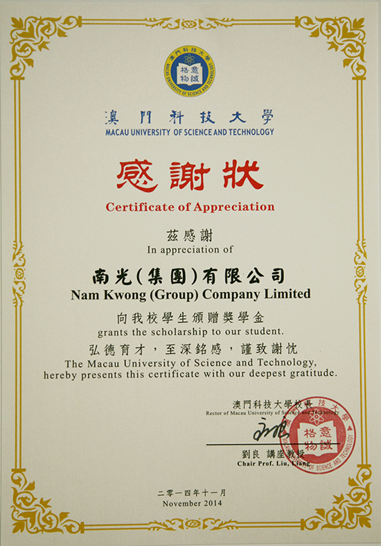 11月14日,澳门科技大学举办机构奖助学金颁奖典礼,南光集团,中国银行澳门分行,澳门基金会等17家机构应邀参加仪式,南光集团赵玉阜总法律顾问受许开程董事长委托参加典礼仪式,为获得南光奖助学金优秀学生颁发奖金、证书,并接受科技大学刘良校长颁发的感谢状。