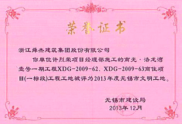 今年4月17日及6月18日,在无锡市建设局文明工地评审及江苏省住房和城乡建设厅、省建设工会工作委员会对现场安全和文明施工管理考核评审中,无锡项目一期工程分别被评为2013年度无锡市市级文明工地及江苏省2013年第三批建筑施工省级文明工地。
