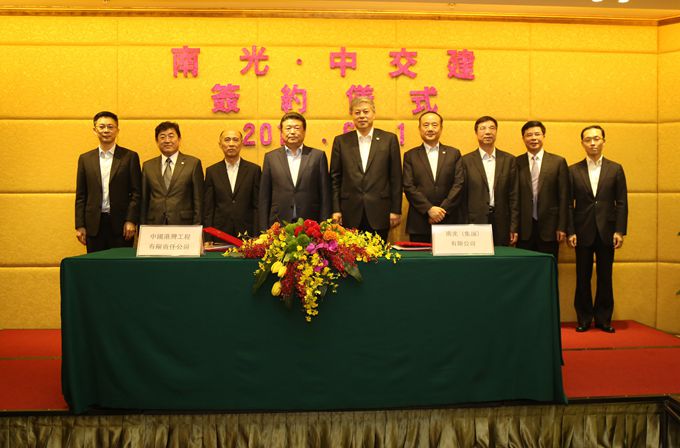 6月1日上午,南光集团与中国交通建设集团有限公司在万豪轩签署战略合作框架协议。南光集团傅建国董事长、中交建集团刘起涛董事长、澳门中企协会许开程会长、南光集团段洪义总经理、 中国港湾林懿翀董事长出席活动并见证签约。南光集团李志忠副总经理与中交建集团孙子宇副总裁代表双方签约。南光集团宋晓冬助理总经理与中国港湾王玮总经理代表双方同时签署了港珠澳大桥澳门口岸管理区工程委托实施协议。