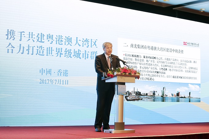 南光集团傅建国董事长在论坛中发表演讲,指出粤港澳大湾区的战略意义,并介绍了南光集团在大湾区建设中的机遇、责任和担当。