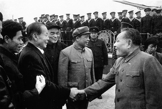 1984年1月29日,中共中央军委邓小平主席(前右一)在军舰上接见南光公司创办人——柯正平总经理(前右三)。