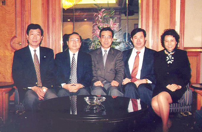 1999年1月,王文德董事长(右二)、丁亚力总经理(右一)和华润集团谷永江董事长(中)拜访新华社澳门分社时,与王启人社长(左二)、李水林副社长(左一)合影。