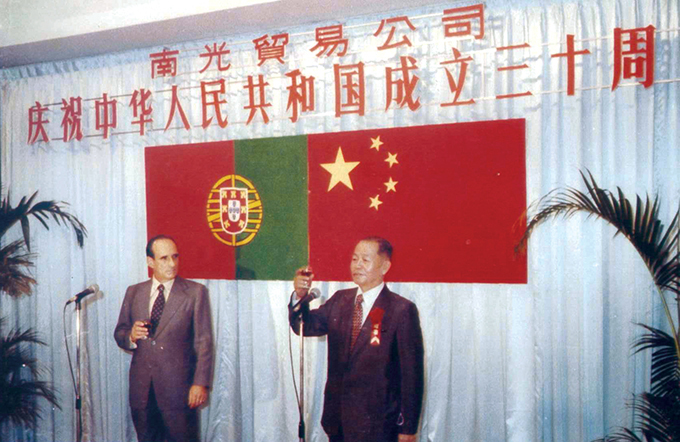 柯正平总经理(右)与澳督伊芝迪先生在酒会主席台上,柯老致祝酒词后向来宾祝酒(摄于1979.9.30)。