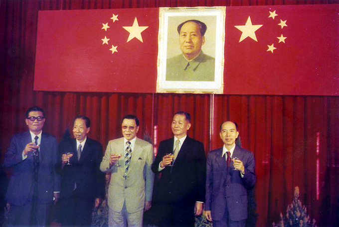 南光集团庆祝中华人民共和国成立25周年酒会。左起:曾谷先生、崔德祺先生、何贤先生、柯正平总经理、马万祺先生(摄于1974.9.30)。