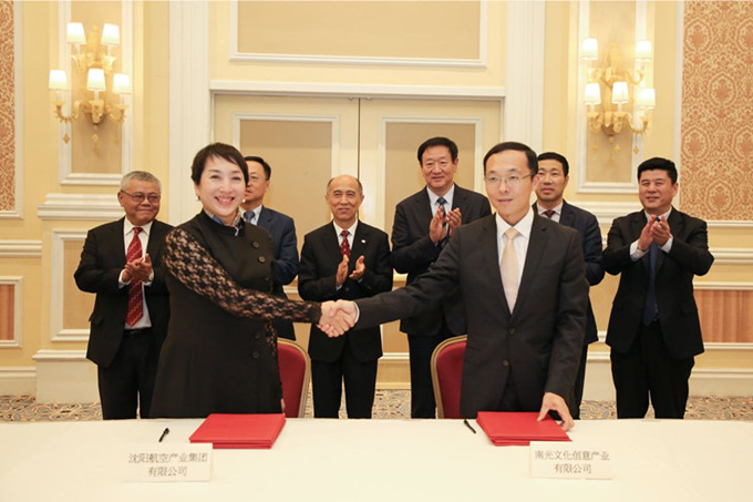 在集团总经理段洪义和沈阳市人大常委会主任潘利国的见证下,2018年11月“濠江盛汇-澳门汽车、游艇、公务航空展”期间,南光文创与沈阳航空产业集团签署了战略合作协议。集团助理总经理宋晓冬、沈阳市人大秘书长李军、沈阳市外办主任王晶莹、沈阳市服务业委员会副主任张利、沈阳航空产业集团董事长曹晓玲等参加了签约仪式。