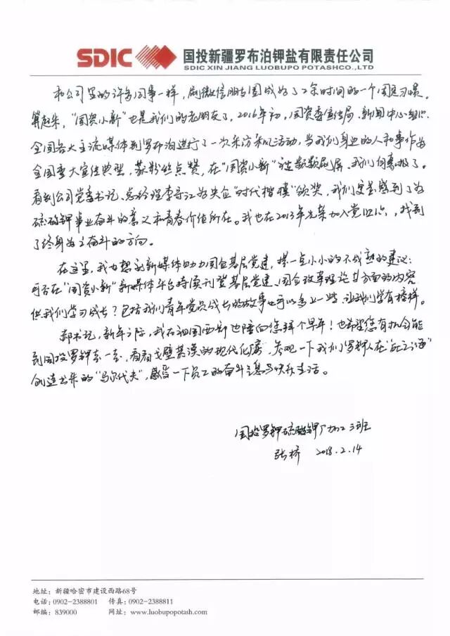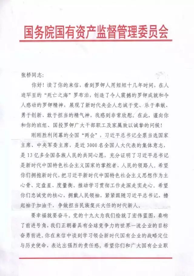 我是国投新疆罗布泊钾盐有限责任公司的一名普通的85后员工。前几天,通过“国资小新”微信看到了您在接受《求是》杂志专访的《新时代国有企业的战略定位与历史使命》文章,受益匪浅。您的思考,通篇贯彻着习近平新时代中国特色社会主义思想,为我们讲述了新时代国有企业的战略定位、历史使命和改革发展的新目标新举措,不仅解开了我们基层员工的一些思想困惑,也指明了我们国企未来的发展方向。所以,就想通过写信的方式和您交流一下学习心得。