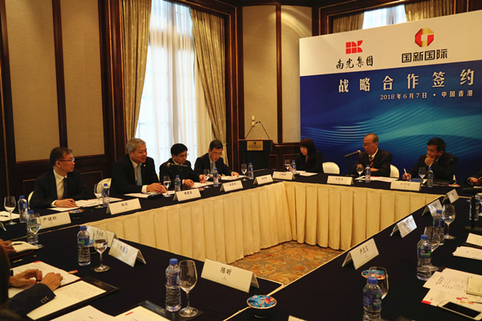6月7日下午,南光集团董事长傅建国应国新国际投资有限公司邀请,赴香港与国新国际董事长刘东生、总经理周育先等深入交流推动国际化合作事宜。南光集团总会计师彭晋鸿代表集团与国新国际签署战略合作协议。南光集团发展规划部常务副总经理杨东、资产经营部常务副总经理施雨林等参加活动。