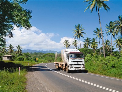 瓦努阿岛是南太平洋岛国斐济第二大岛。中铁一局斐济公司在岛上修建的纳布瓦鲁高速公路和布扎贝高速公路解决了人们出行的“老大难”问题,有力拉动了经济发展,被斐济民众誉为“斐中两国友好的纽带”“共同发展致富的高速路”。图为一辆卡车行驶在布扎贝高速公路上。
