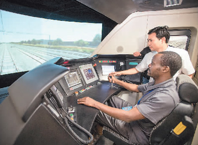 日前,来自泰国、斯里兰卡、老挝等13个国家的63名铁路管理人员来到武汉高铁训练段进行参访交流活动。在“一带一路”背景下,2015年开始武汉高铁训练段已举办了泰国、老挝等14批涉外铁路技能培训班,培训涉外学员400余人次。图为来自肯尼亚的贾斯特斯·卡洛·姆文加在高铁模拟驾驶仓内体验实际操作。