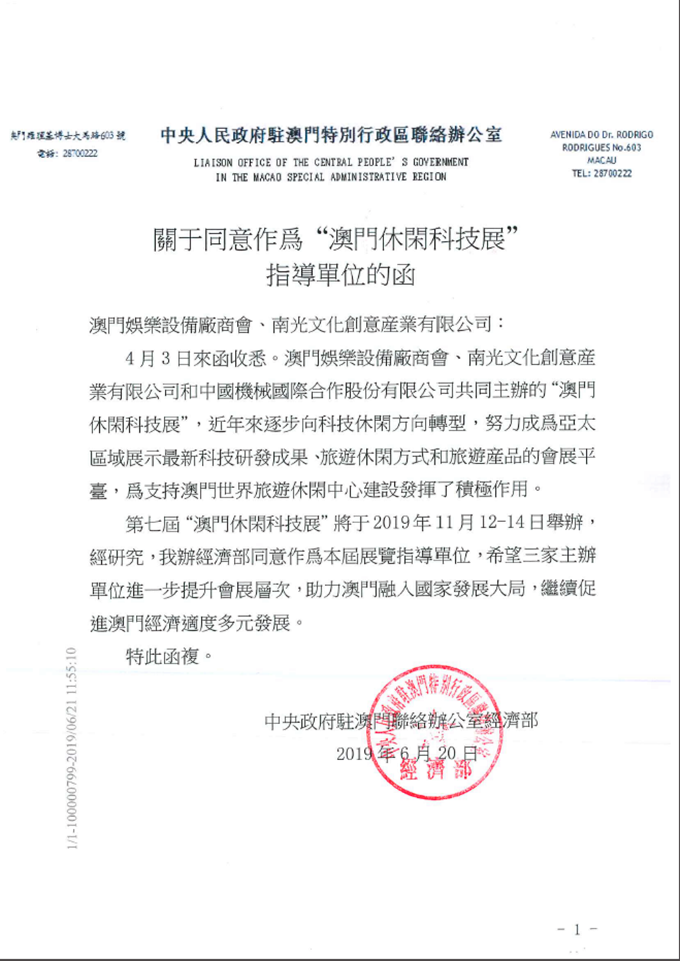 今年4月,南光文创致函中联办,祈请傅自应主任为澳门休闲科技展题词,并邀请中联办经济部作为展会的指导单位。傅自应为展会题词“荟萃澳门科技,创造澳门智慧”。6月20日,中联办经济部经研究决定,复函南光文创,同意作为本届MGS展的指导单位。中联办经济部在函中肯定了MGS展努力成为亚太区域展示最新科技研发成果、旅游休闲方式和旅游产品的会展平台,为支持澳门世界旅游休闲中心建设发挥了积极作用,希望主办单位进一步提升展会层次,助力澳门融入国家发展大局,继续促进澳门经济适度多元发展。