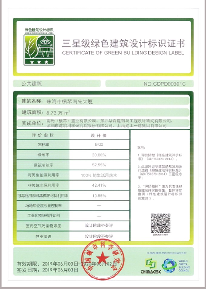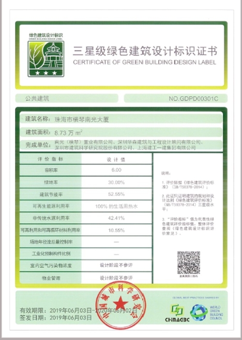 项目在规划设计之初,南光置业下属横琴公司就明确提出了“绿色三星”建筑目标,并聘请深圳市建筑科学研究院作为咨询顾问,协助项目整体构思与绿建技术相融合的建筑方案,同时横琴公司对项目绿建设计和标准实施进行全过程跟踪管理,并于近期获得了中国城市科学研究会的绿建三星认证。项目运用了中水回收利用、区域供冷高效空调、室内污染物浓度监控及空气净化、高效照明和节水等系统设备,采用了建筑围护结构节能、节材、自然通风采光、地下一层光导管、太阳能热水等先进设计技术,打造绿色特征明确、全生命周期环保节能和高效健康的办公酒店类建筑,创造更加健康舒适的办公和居住环境。