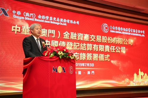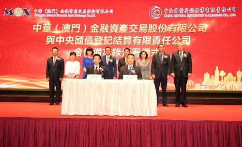 7月3日下午,中华(澳门)金融资产交易股份有限公司(以下简称MOX)与中央国债登记结算有限责任公司(以下简称中债登)在澳门旅游塔3楼宴会厅举行合作备忘录签署仪式。澳门特区政府经济财政司司长梁维特、国家财政部金融司司长王毅、澳门中联办经济部副部长朱宏、中葡论坛(澳门)常设秘书处秘书长徐迎真等嘉宾出席主礼,集团董事长兼MOX董事长傅建国、中债登董事长水汝庆共同出席主礼并分别致辞。MOX执行委员会主席张维春代表MOX与中债登签署合作备忘录。集团总会计师兼MOX副董事长彭晋鸿、集团常务董事陈质颖以及澳门金融界、工商界代表100多人出席活动。