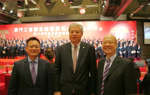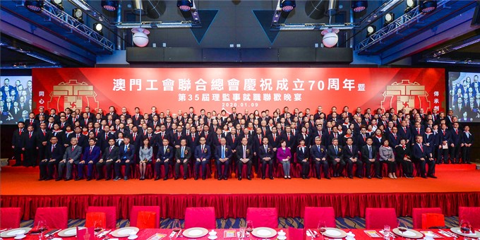1月9日晚,集团董事长傅建国在澳门旅游塔出席澳门工联总会庆祝成立70周年暨第35届理监事就职联欢晚宴。澳门特区行政长官贺一诚,全国政协副主席何厚铧,澳门中联办主任傅自应,中华全国总工会副主席江广平,外交公署特派员沈蓓莉,澳门特区立法会主席高开贤,广东省总工会常务副主席陈伟东,澳门工联总会会长何雪卿,澳门特区政府经济财政司司长李伟农、保安司司长黄少泽、社会文化司司长欧阳瑜、运输工务司司长罗立文,香港工联会会长吴秋北等嘉宾共同出席主礼。