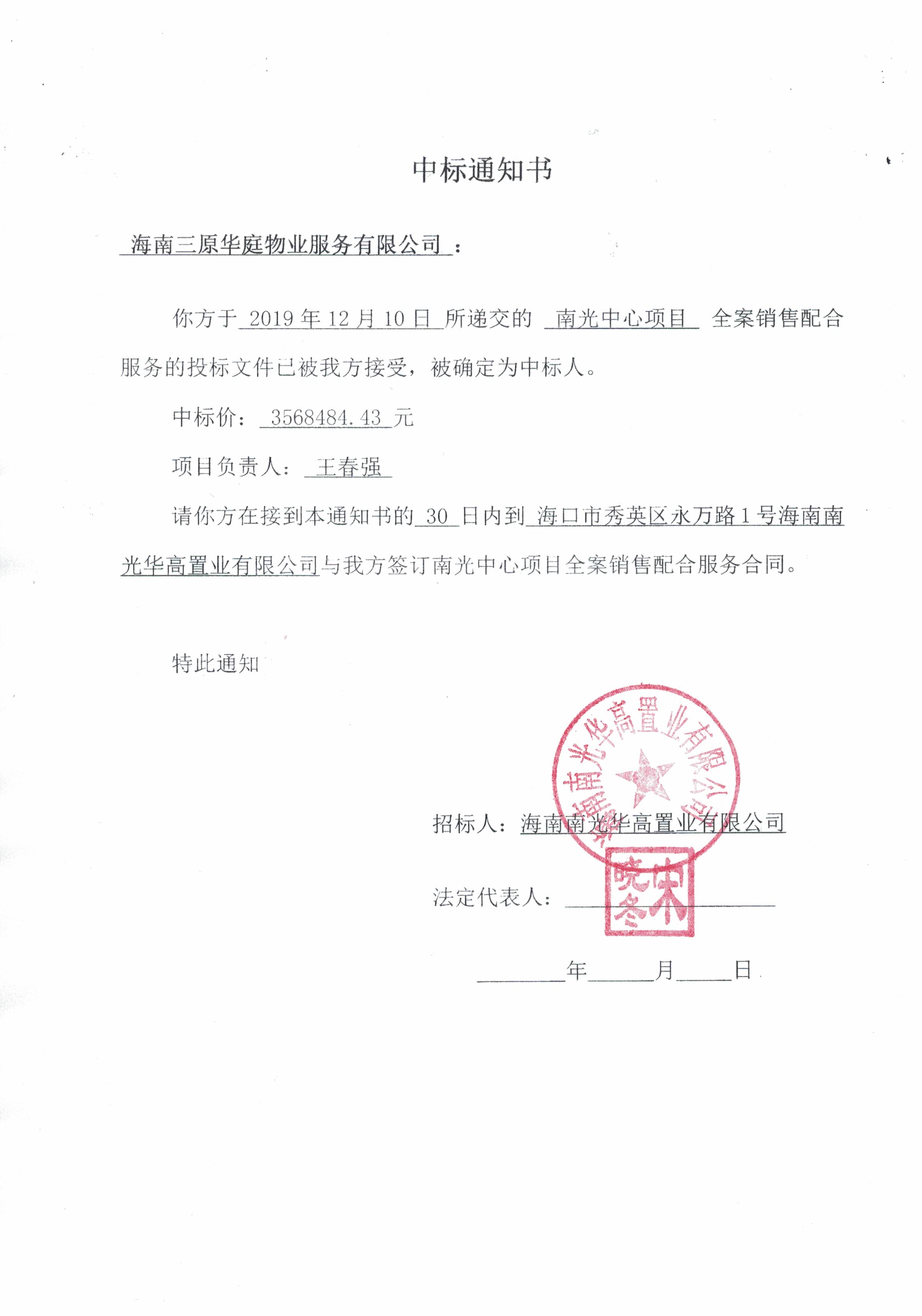 南光中心项目全案销售配合服务中标通知书公示