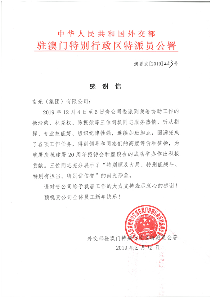 近期,南光集团收到一封来自外交部驻澳门特别行政区特派员公署的感谢信,感谢信内主要表扬澳门中旅客运中心负责接载的徐浩乘、林亮权、陈振荣等3位车长服务热情、听从指挥、专业技能好、组织纪律性强,连续加班加点,圆满完成了各项工作任务,得到领导和同志们的高度评价和赞扬,为公署庆祝建署20周年招待会和座谈会的成功举办作出积极贡献。信函充分肯定了3位车长”特别顾及大局、特别能战斗、特别有担当、特别讲信誉”的南光形象。