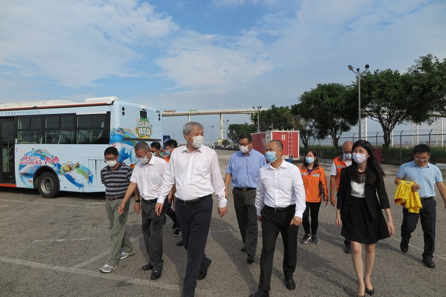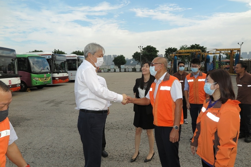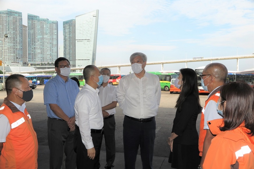 在澳门中旅观光塔车场,傅建国亲切慰问了各岗位上为保证节日期间公交正常运行而坚守努力的员工,对巴士公司狠抓公交防疫、运营安全、提升服务质量表示肯定,勉励各位员工为澳门市民的安全出行继续努力。