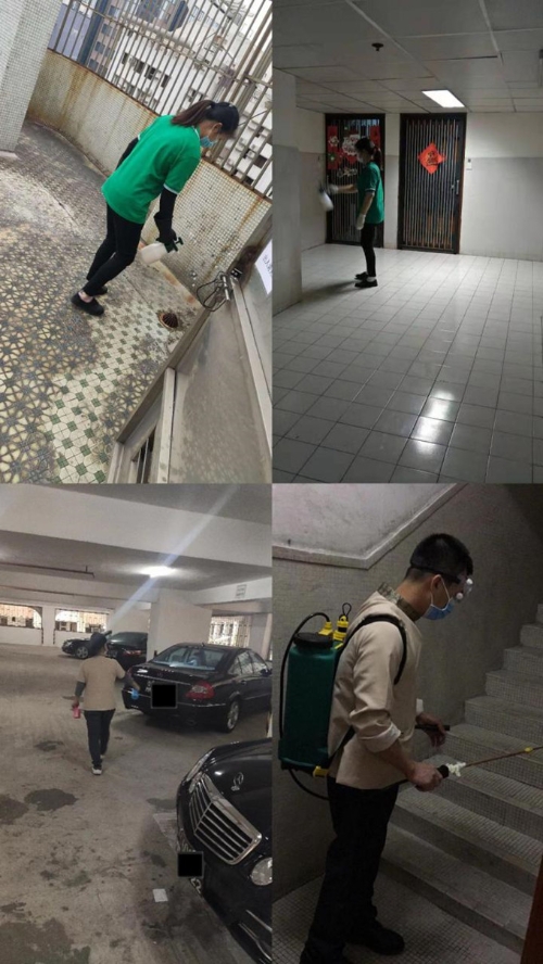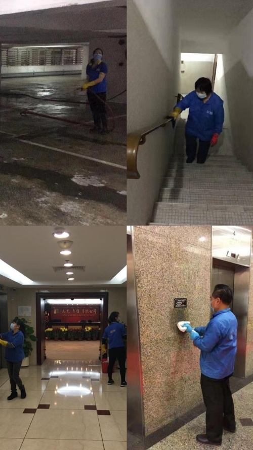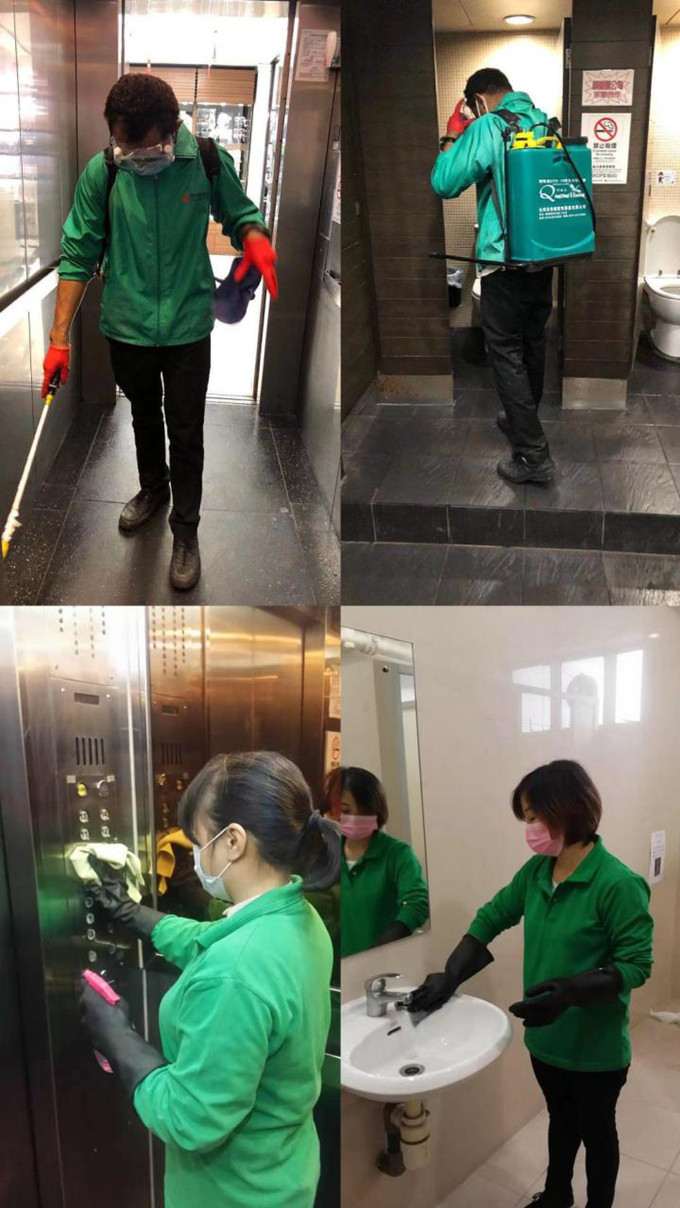 怡珍阁商场、南华商业大厦公共区域消毒清洁,自上而下由左至右:EDI SANIAYA、许艳华