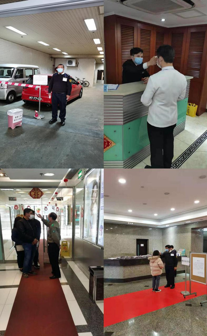 南光大厦、南园宿舍、南华商业大厦等每日24小时为进入人员测量体温,自上而下由左至右:保安人员RUBEN、钟春明、林燕鸿、KRISHNA