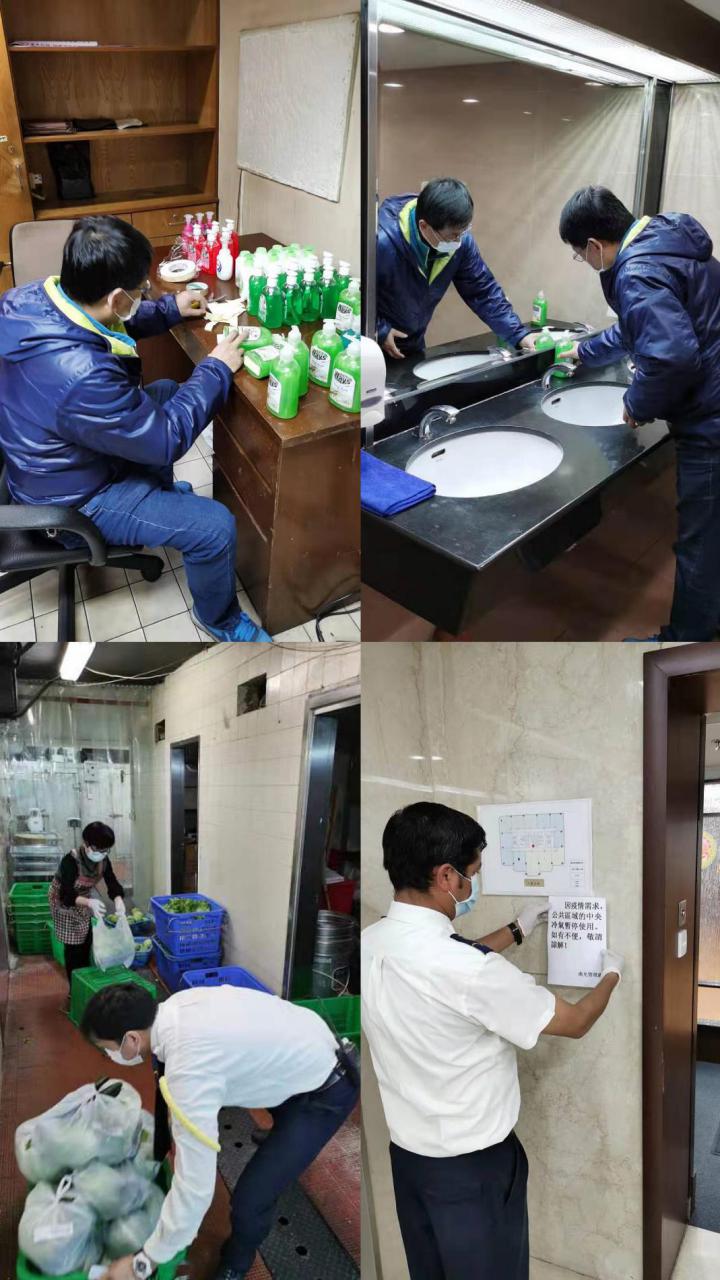 “您好,测量下体温。”“请出示您的员工牌”“您是从哪里回来的?”“最近有咳嗽等感冒症状吗?”保安员们一手握着电子温度计,另一只手迅速记录下进入大厦人员的种种信息,为了保证宁可十防九空、不可失防万一,大厦每一个进出口都设专人专岗值守全覆盖式测量体温。清洁员们加强公共区域的消毒频次:使用消毒水及75%医用酒精对南光大厦、南园宿舍、怡珍阁商场、南华商业大厦公共区域进行彻底清洁消毒,每两小时对电梯客厢、洗手间、门把手、走火梯扶手等进行重点消毒。每日早8:00至午夜24:00点共消毒9次;公共区域外围楼层走廊、垃圾房共消毒3次;地漏消毒1次。积极用心宣传防疫措施,如何防范疫情感染;设立废弃口罩回收点,避免一次性口罩二次使用;每日定点汇总当日工作简报,异常情况立即上报。全力做好数千员工最后一道屏障,让大家安心上班、放心回家。