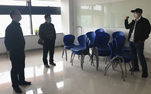 大厦每一个进出口都设专人专岗值守,全覆盖式测量体温,南光置业副总经理范吉生现场巡查各个进出口工作情况,由左至右:黄仕田、叶先逢、范吉生
