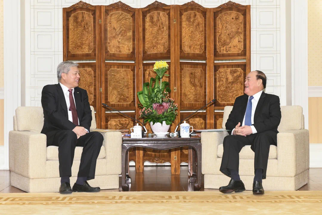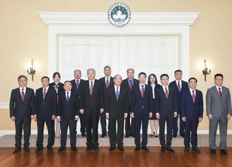 澳门特区行政长官贺一诚11月19日在政府总部会见澳门中国企业协会会长傅建国一行,双方就金融、建筑和电讯等行业的发展,以及横琴粤澳深度合作区建设等议题交换意见。