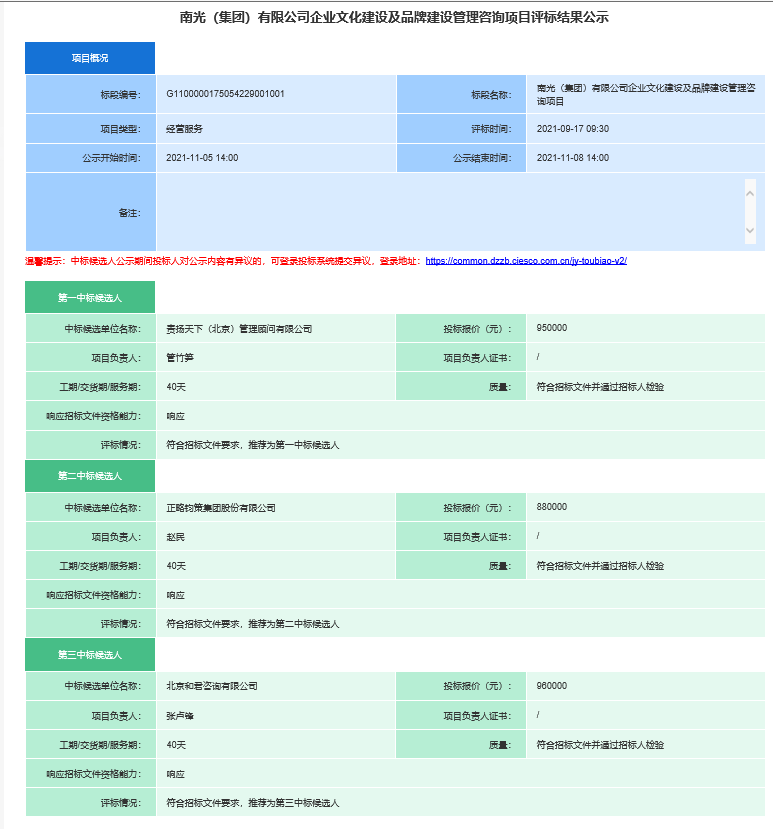 南光(集团)有限公司企业文化建设及品牌建设管理咨询项目评标结果公示