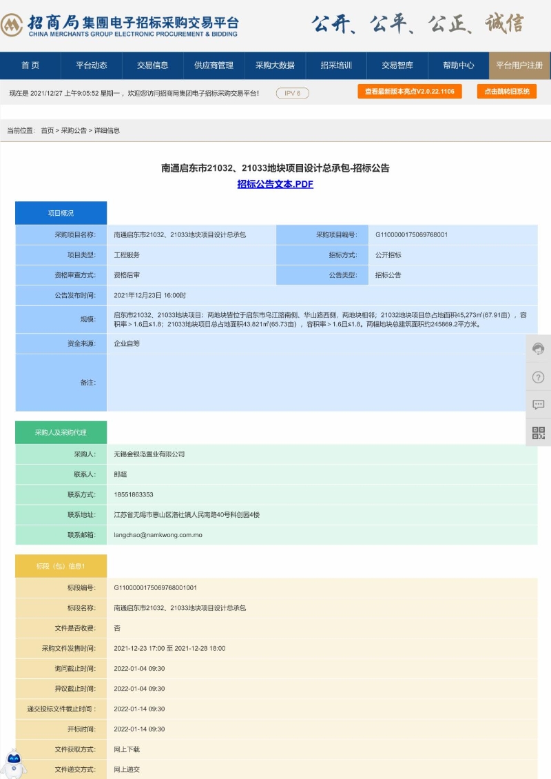 南通市启东市21032、21033地块项目设计总承包招标公告