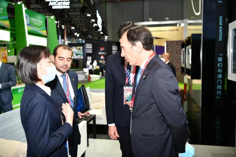 第三届进博会期间葡萄牙驻华大使一行到南光“与澳门同行”主题特展区参观交流,南光澳中旅员工张婧雯用葡萄牙语向其介绍南光集团。