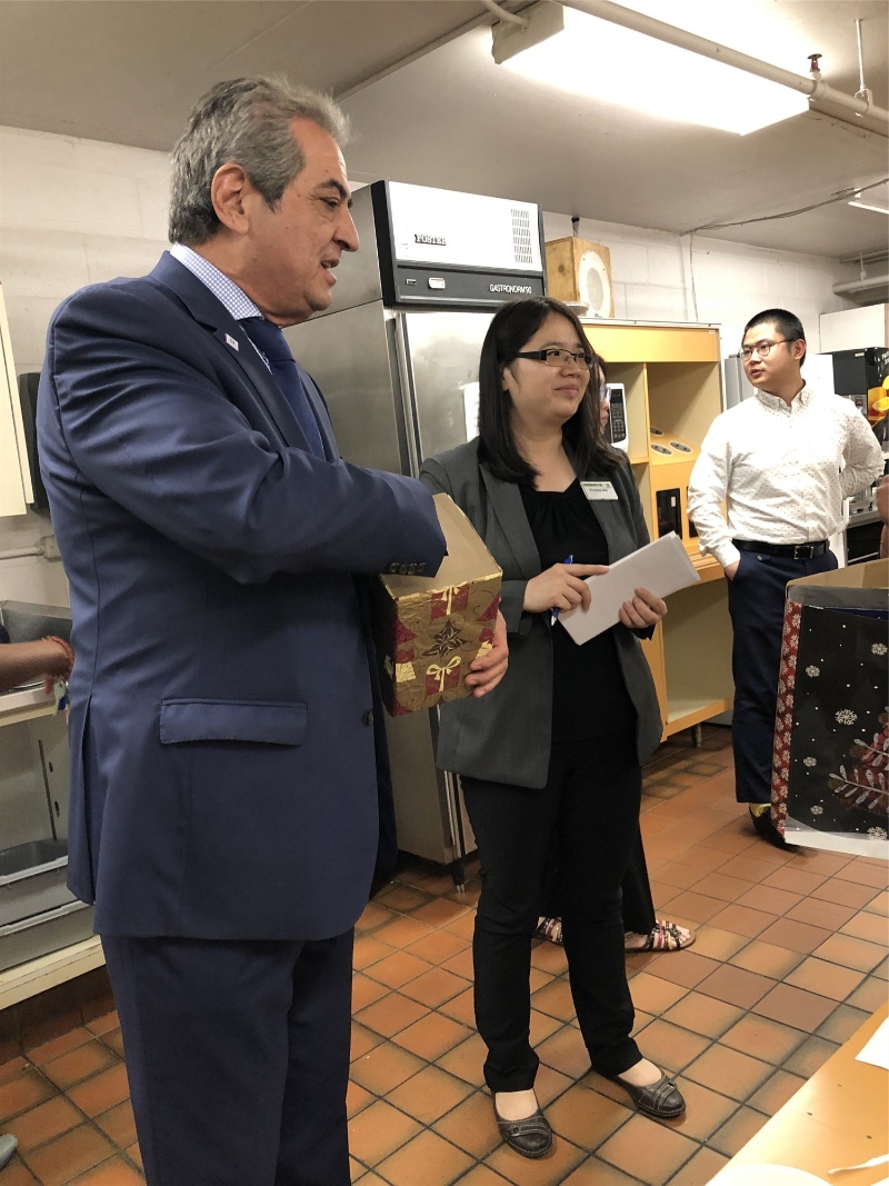 南光澳中旅下属加拿大枫华实业有限公司秘书候莹清与外籍管理人员共同主持,组织幸运抽奖活动。