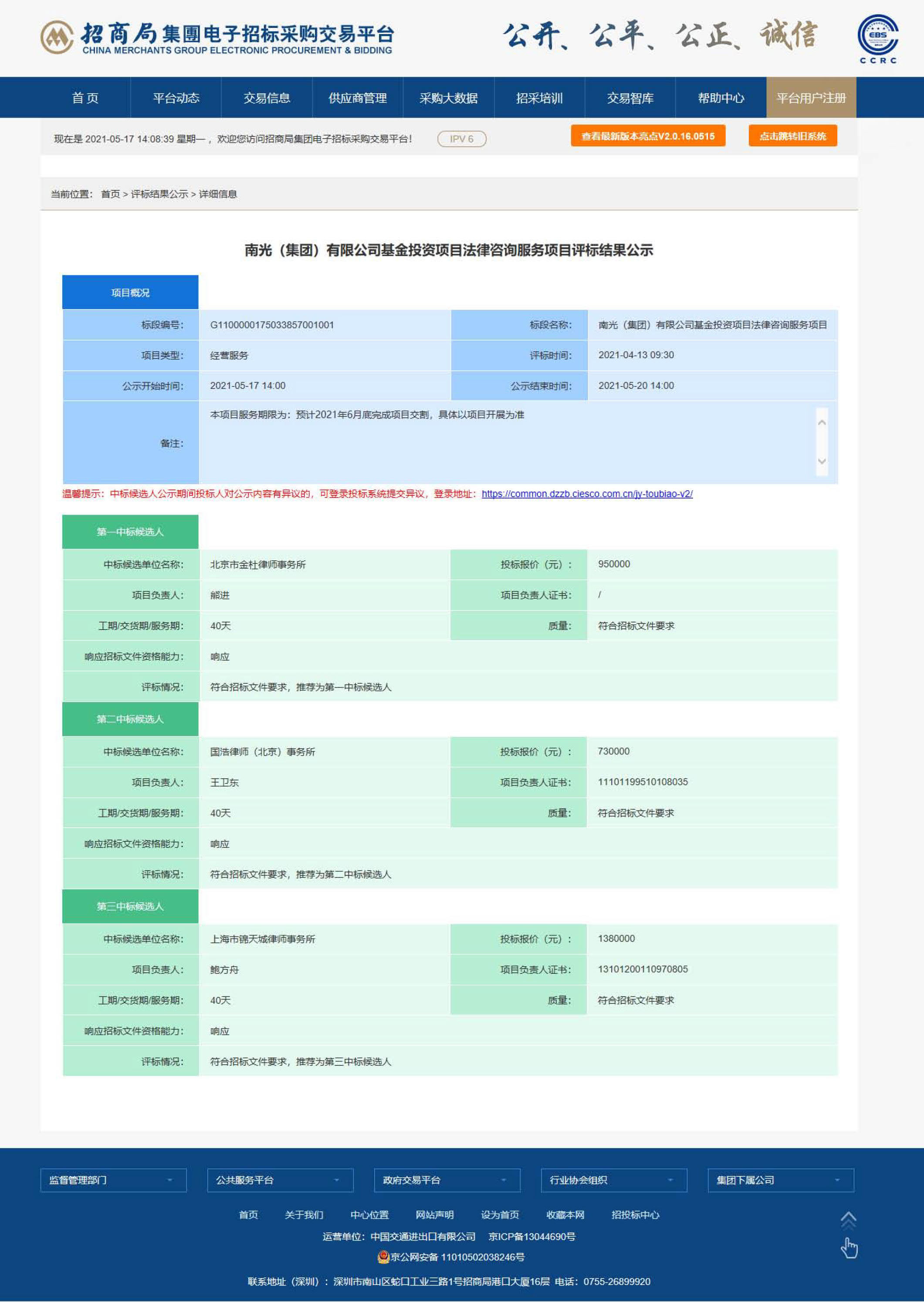 南光(集团)有限公司基金投资项目法律咨询服务项目中标候选人公示