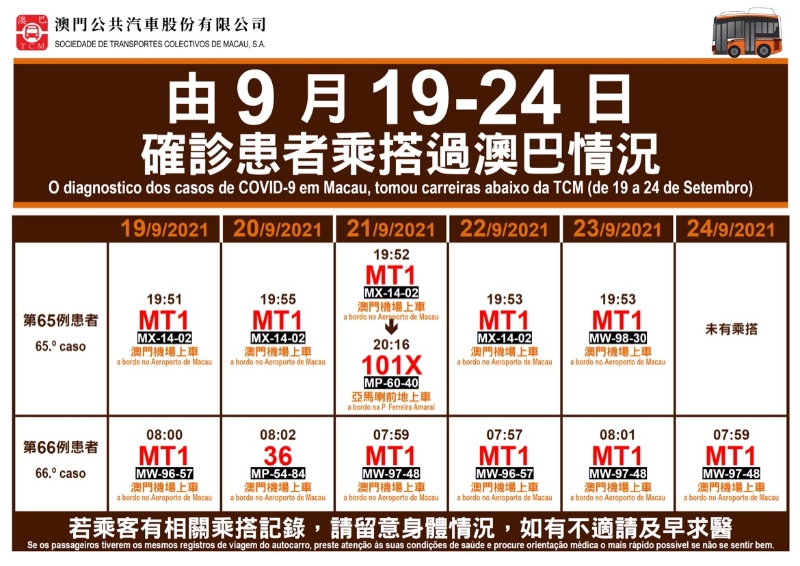 9月24日至今,澳门新增确诊第65及66例新型冠状病毒感染病例,据政府公布讯息及透过澳门通资料调查显示,确认2名确诊者于9月19日至24日均有乘坐南光澳巴辖下36、MT1及101X路线。在接到相关资讯后,澳巴第一时间采取应急防疫措施,查明涉事车辆及车长,并立刻在澳门媒体公布确证病例详细行踪讯息。