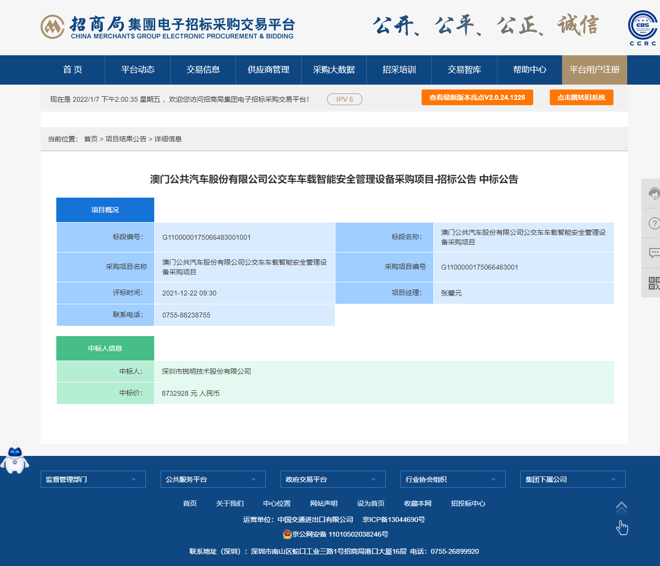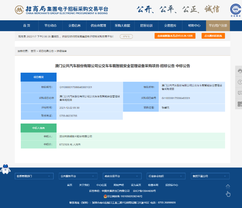 澳门公共汽车股份有限公司公交车车载智能安全管理设备招标结果公告