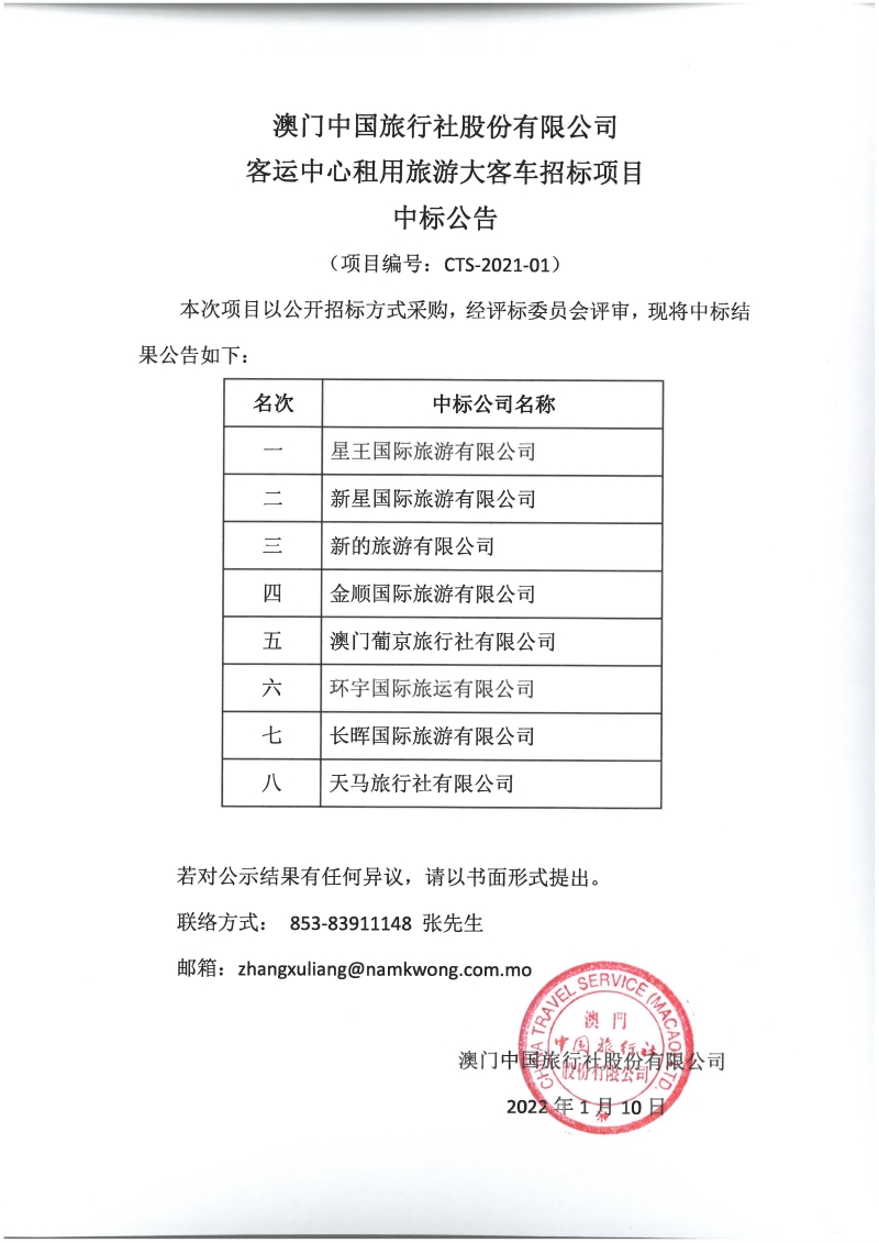 南光澳中旅租用旅游大客车招标项目的中标公告