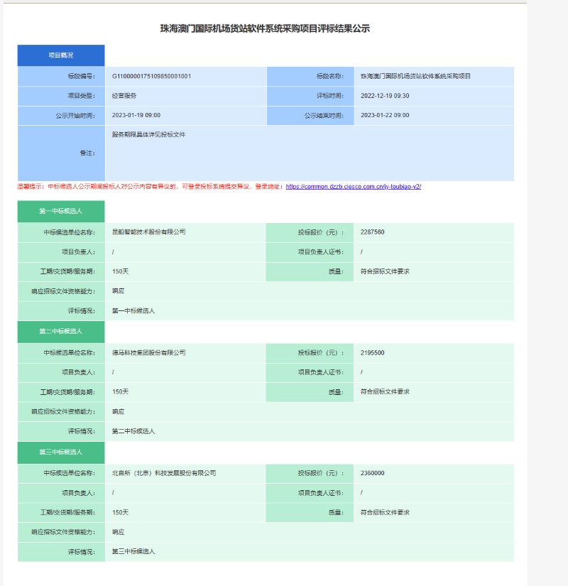 珠海澳门国际机场货站软件系统采购项目评标结果公示