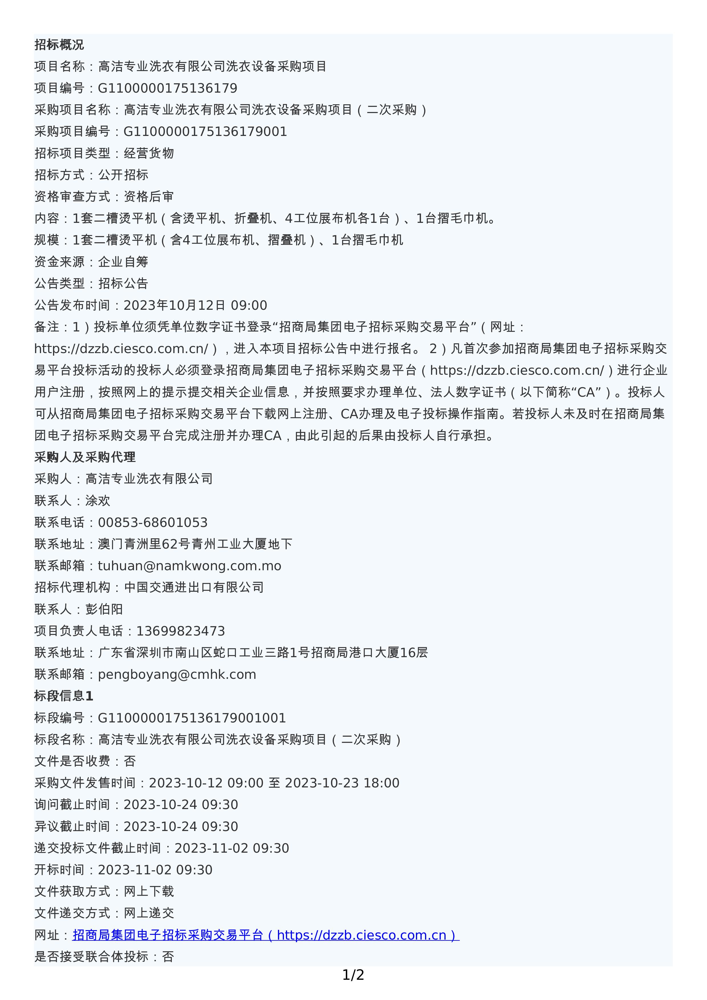 高洁专业洗衣有限公司洗衣设备采购项目(二次采购)招标公告.pdf