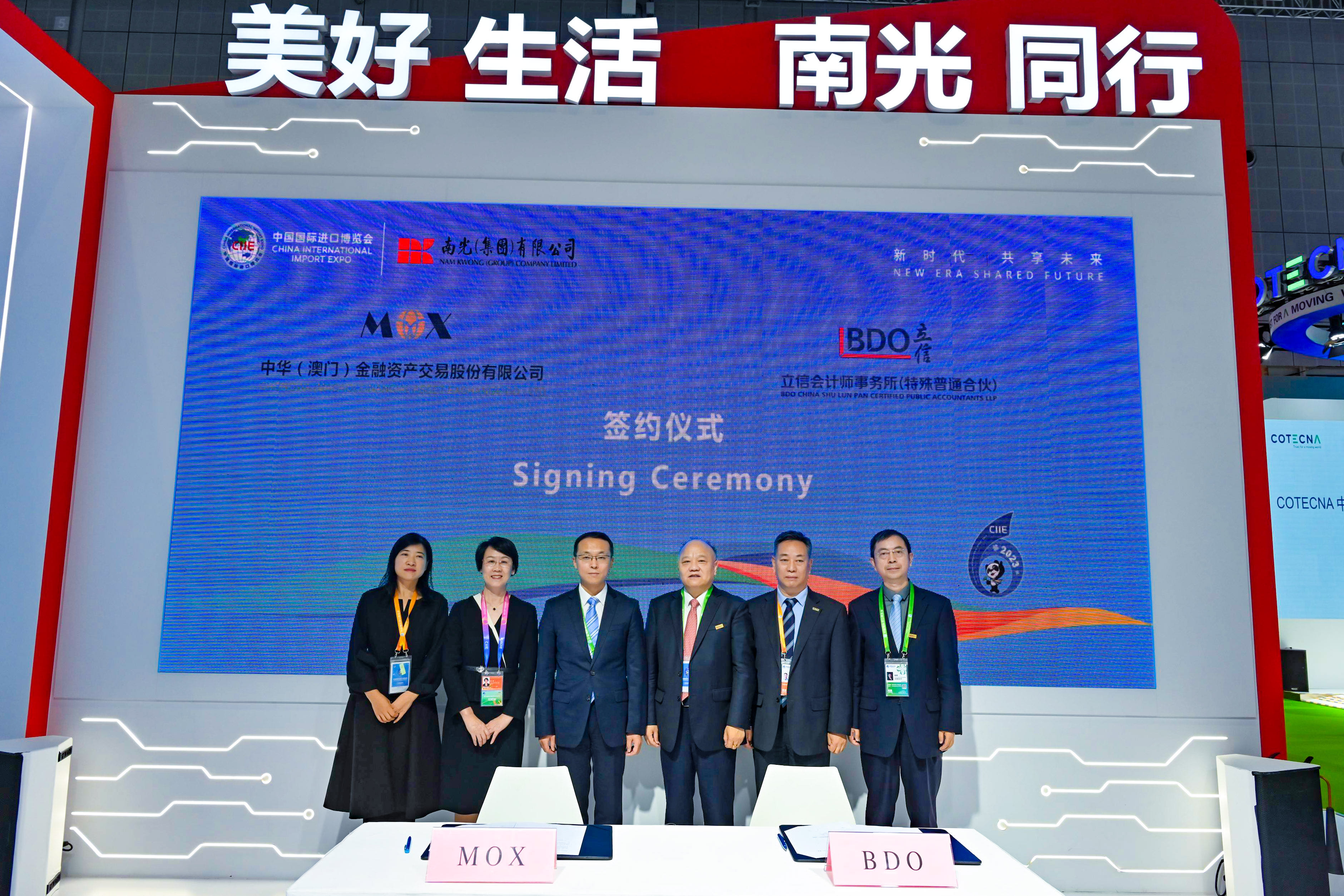 南光集团积极践行“南光+”合作发展理念,充分利用进博会全球合作重要平台作用,11月5日下午和6日上午,集团在进博会展馆举办集中签约活动。本轮签约广泛涉及能源化工、国际贸易、旅游客运、会议展览、城市基建、生物医药、金融债券、新能源汽车等多个领域,签约额达4065万美元,创历届新高,积极助力国家新发展格局构建及澳门经济适度多元发展。集团副总经理宋晓冬,立信会计师事务所首席合伙人、董事长朱建弟,天津中石化悦泰公司总经理朱宗敏,中通客车党委书记、总经理王兴富,狮派(柬埔寨)有限公司(CIPEL)总经理胡肖龙,首创证券副总经理、董事会秘书何峰,上海捷诺总经理夏小凯,东浩兰生集团副总裁周瑾,宁德时代商用副总裁曹治,南光置业董事长邓耀民,南光物流董事长张清,集团战略发展部副总经理范高燕及有关二级公司和参股企业负责人等出席签约仪式。