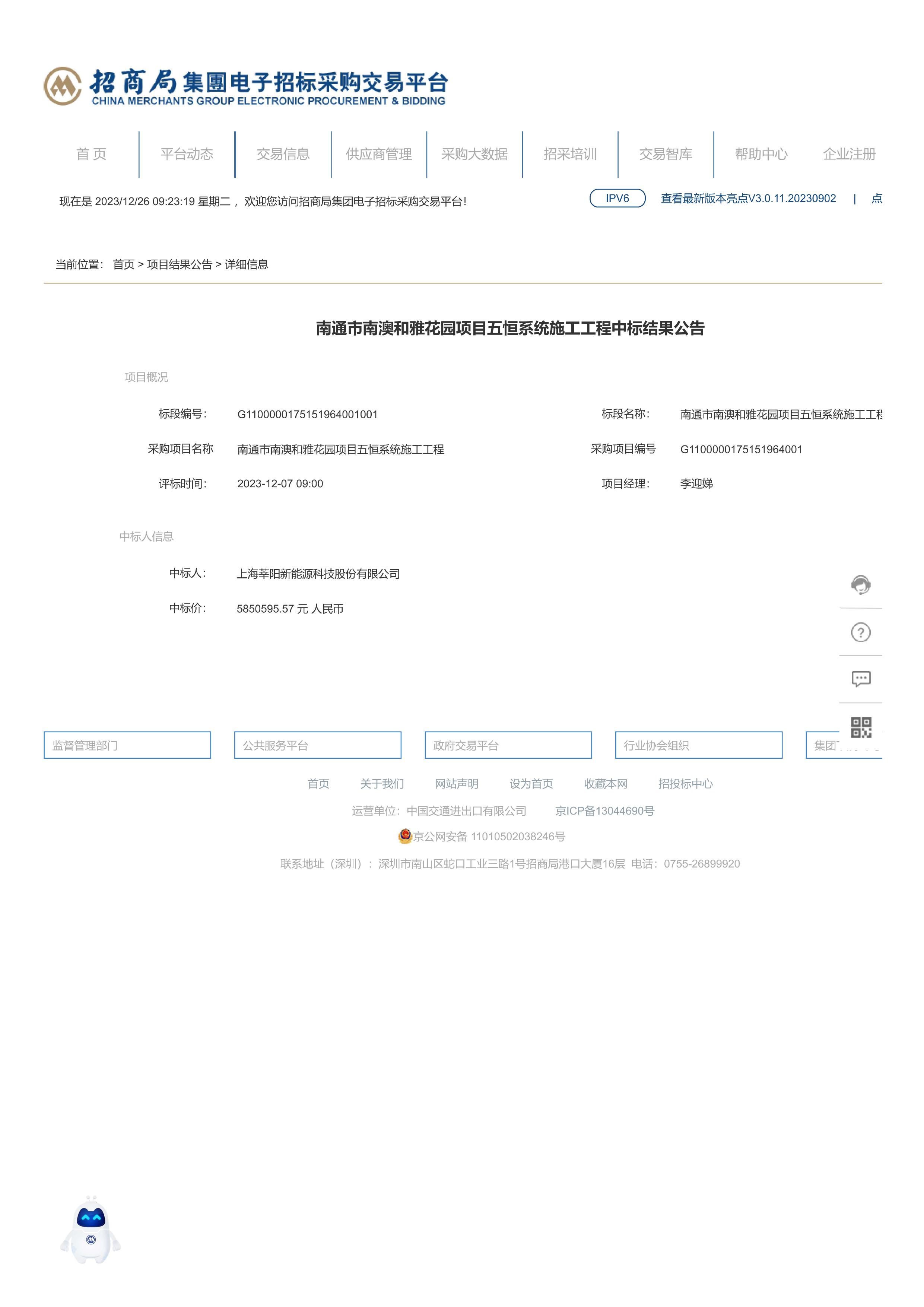 南通市南澳和雅花园项目五恒系统施工工程中标结果公示