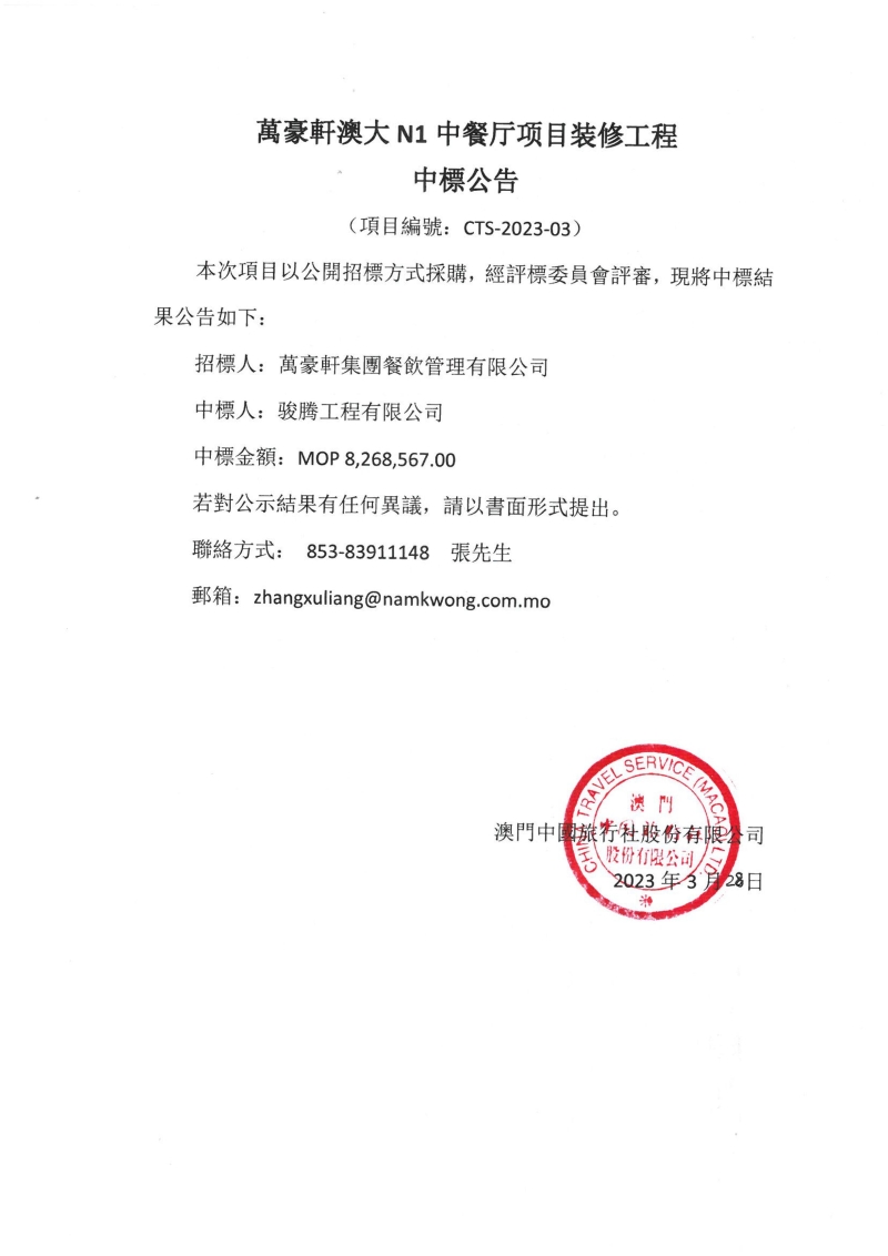 萬豪軒澳大N1中餐廳項目裝修工程中標公告.pdf