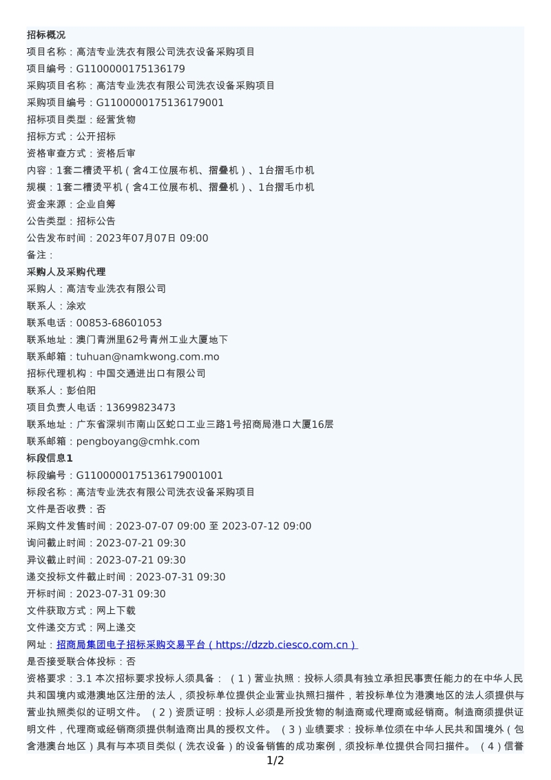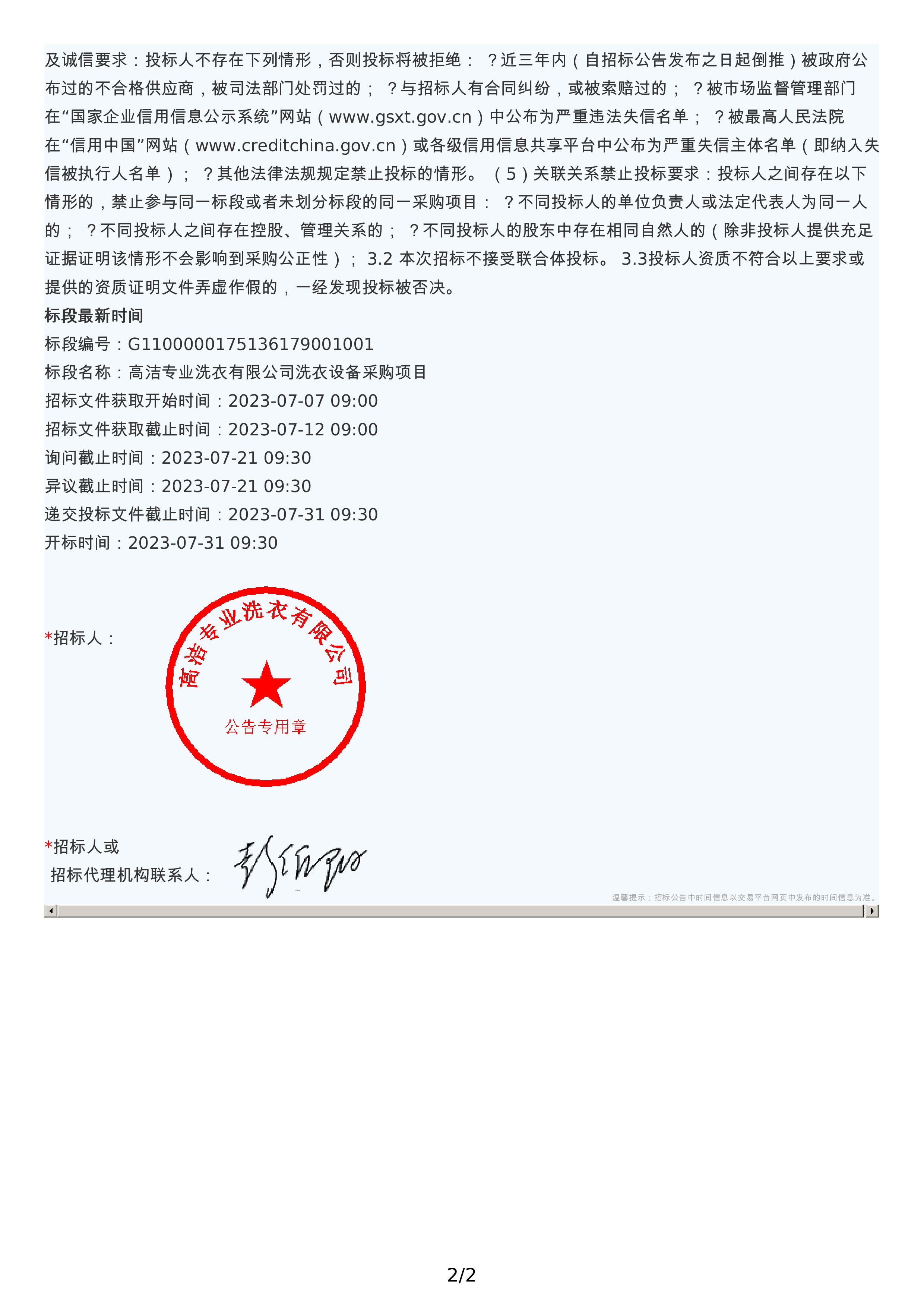 高洁专业洗衣有限公司洗衣设备采购项目招标公告.pdf