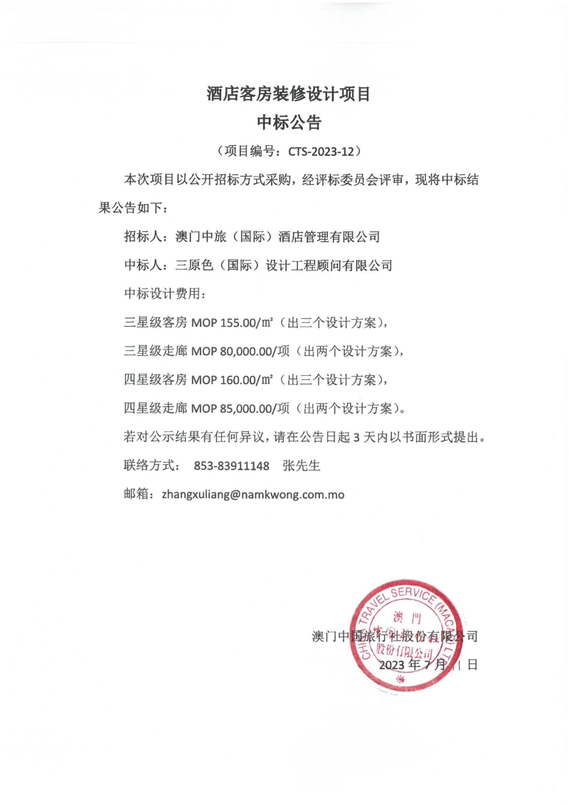 澳門中旅(國際)酒店管理有限公司旗下酒店客房装修设计项目中标公告