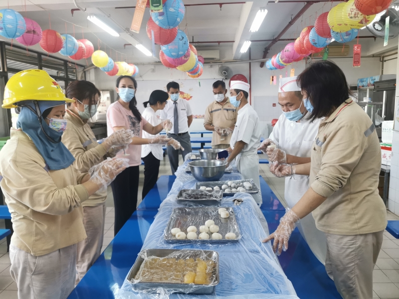 九澳油库做冰皮月饼现场,南光石油员工们互相切磋,彼此分享喜悦心情。