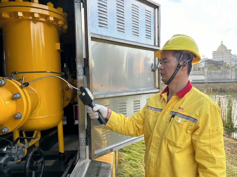 澳门城燃巡线组员工对横琴至澳门天然气撬装进行检测。