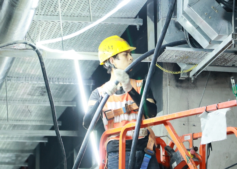 澳门轻轨延伸横琴线项目员工在站厅层进行电缆穿拉工作。
