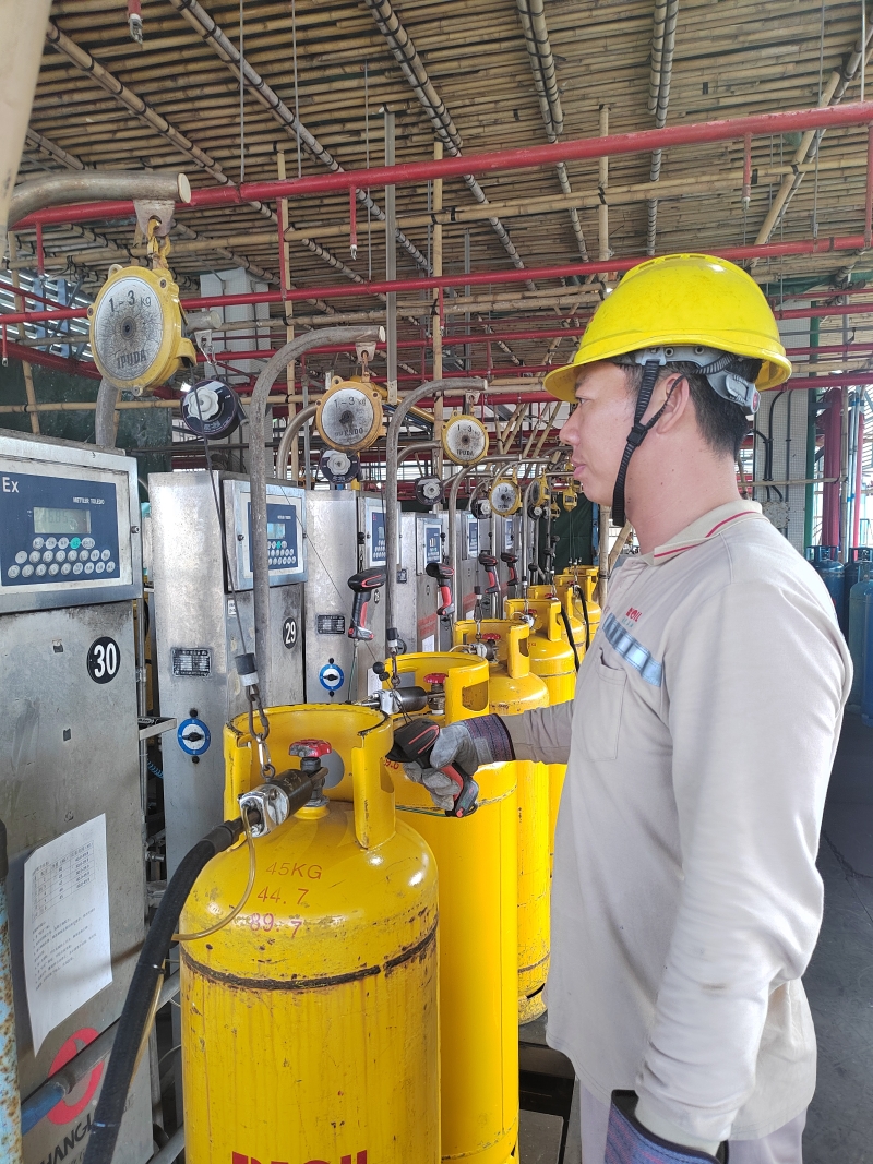 九澳油库石油气组员工灌装作业,保证澳门市场石油气供应。