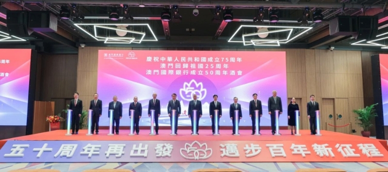 11月18日下午,澳门国际银行庆祝中华人民共和国成立75周年、澳门回归祖国25周年、澳门国际银行成立50周年酒会在澳门旅游塔会展中心四楼举行。全国政协副主席何厚铧,行政长官代表、澳门经济财政司司长李伟农,中联办副主任吕玉印,外交部驻澳门公署特派员刘显法,澳门立法会主席高开贤,澳门中国企业协会会长、南光集团董事长傅建国,澳门国际银行董事长黄来志等嘉宾共同主礼。集团总会计师冯文红、集团财务部负责人与社会各界400余位嘉宾出席酒会。